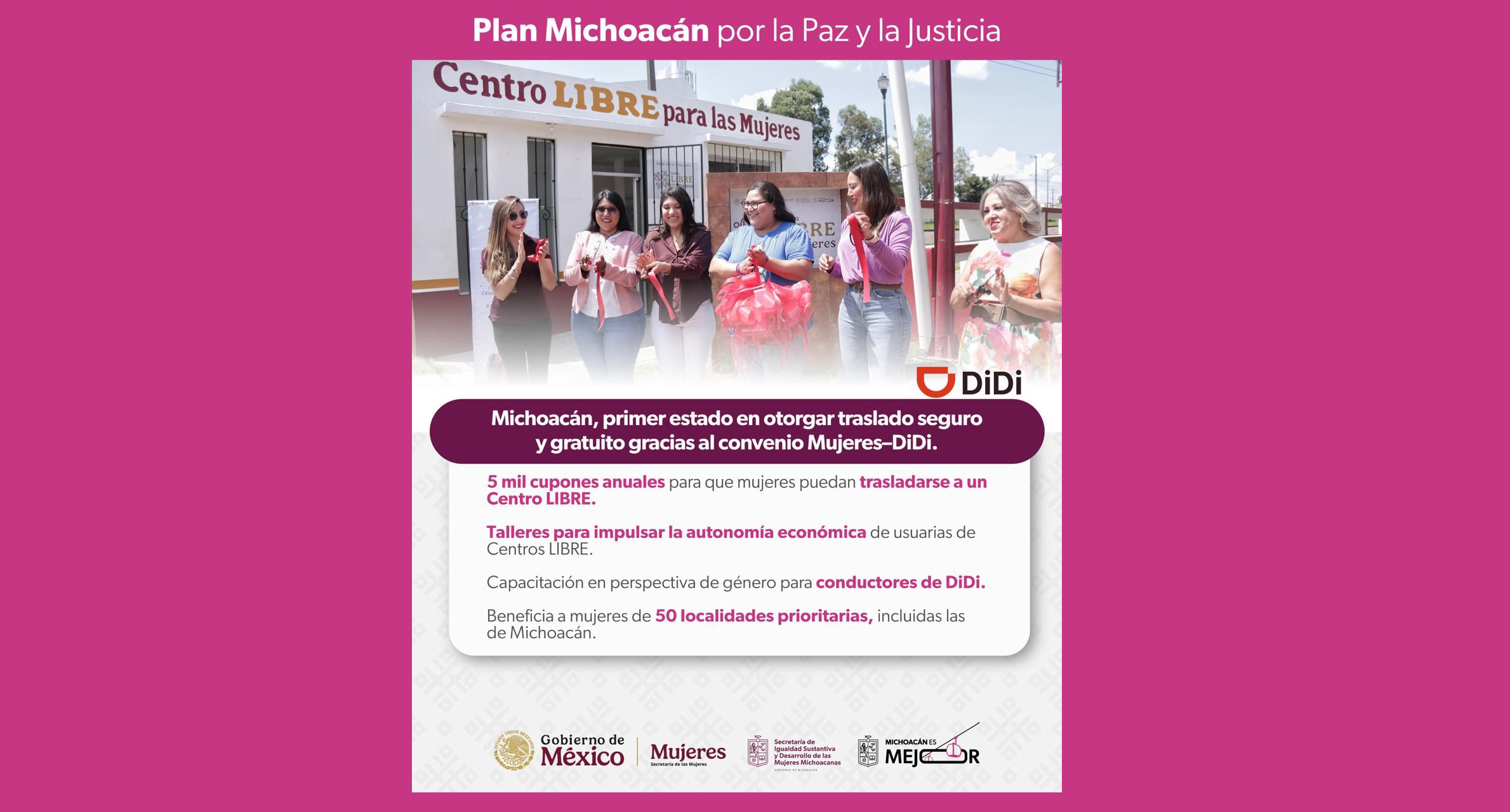 La secretaria de Igualdad Sustantiva y Desarrollo de las Mujeres Michoacanas, Alejandra Anguiano González, informó que gracias al convenio firmado a nivel nacional entre la Secretaría de las Mujeres del Gobierno de México y la plataforma DiDi, Michoacán se convirtió en el primer estado del país en otorgar un traslado seguro a una usuaria que requería acudir a un espacio de atención y regresar a su hogar sin riesgo, mediante los cupones de movilidad para mujeres que requieren acompañamiento seguro.